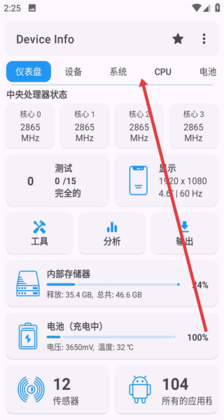 1、打開Device Info應(yīng)用在儀表盤頁點擊系統(tǒng)選項,向右滑動屏幕上方分類條可切換查看系統(tǒng)相關(guān)設(shè)備信息。