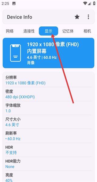 2、進(jìn)入系統(tǒng)頁后點擊顯示選項,即可查看當(dāng)前手機的屏幕分辨率和尺寸刷新率等顯示具體的手機屏幕參數(shù)。
