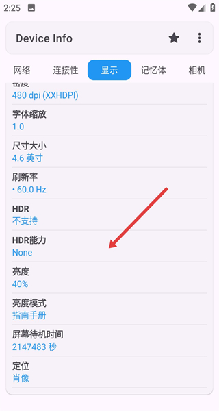 3、在屏幕顯示頁面向下滑動屏幕,可查看更多手機屏幕參數(shù)如HDR能力亮度和屏幕待機時間等顯示信息。