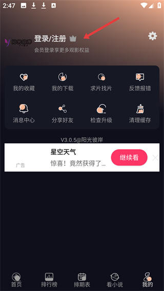 2、在我的頁面點擊登錄且注冊會員登錄后能享受更多觀影權益,還可使用我的收藏我的下載等功能。