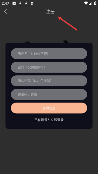 4、在注冊頁面依次填寫用戶名,密碼,確認密碼邀請碼選填,填寫完成后點擊立即注冊若已有賬號可點擊立即登錄。
