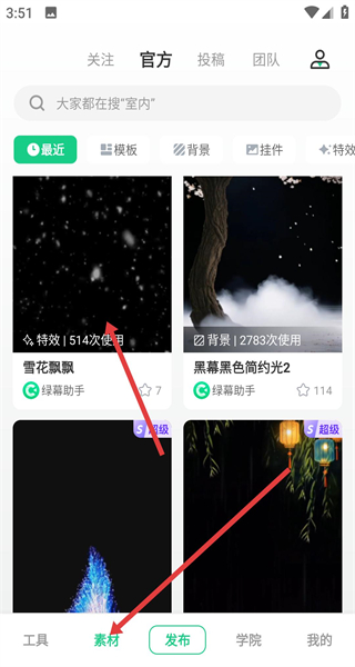 1、進入綠幕助手APP切換到素材頁,通過搜索或瀏覽尋找喜歡的素材,如在官方分類下找到想使用的特效如雪花飄飄點擊進入。