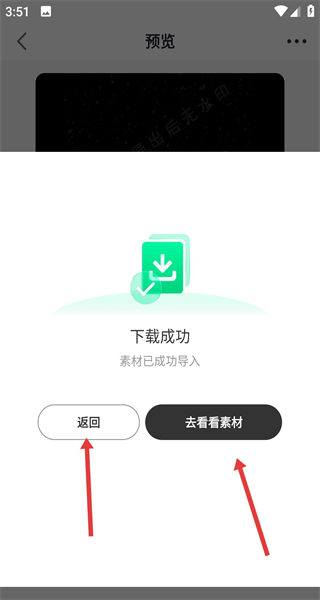 4、素材下載完成后界面顯示下載成功提示,想繼續(xù)挑選其他素材點擊返回素材列表,想查看剛導入的內容點去看看素材進入個人素材管理頁查看。