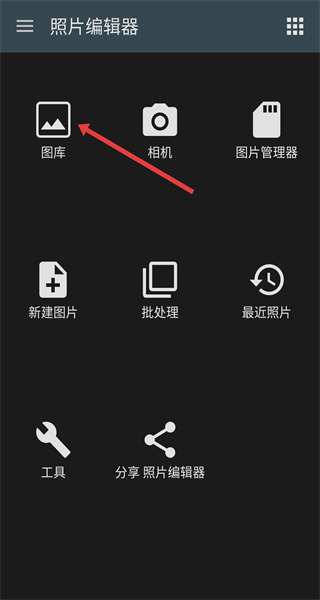1、打開照片編輯器應(yīng)用,在主界面找到圖庫(kù)按鈕,點(diǎn)擊該按鈕,從手機(jī)的圖庫(kù)中挑選出想要進(jìn)行編輯的圖片。