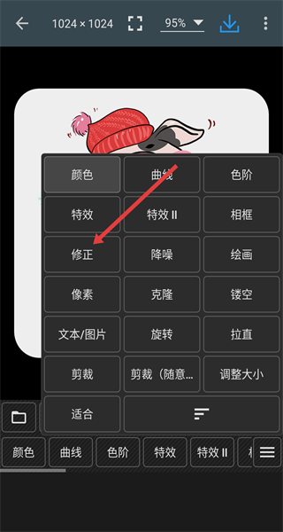 3、在展開的功能選項(xiàng),找到修正選項(xiàng)并點(diǎn)擊,進(jìn)入到圖片修正的相關(guān)界面,此時(shí)能看到多種修正類的功能按鈕。