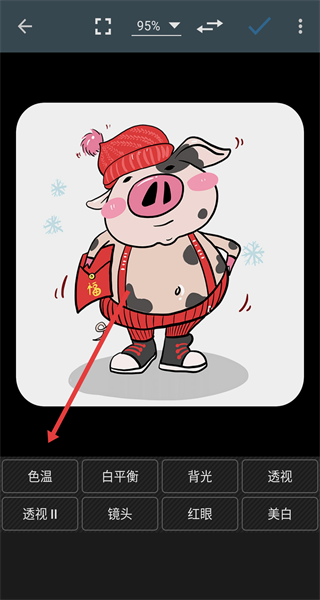 4、在圖片修正界面,根據(jù)需求點(diǎn)擊色溫等具體的修正功能按鈕,對(duì)圖片進(jìn)行相應(yīng)調(diào)整,調(diào)整滿意后,點(diǎn)擊界面上方的確認(rèn)按鈕,完成圖片編輯。
