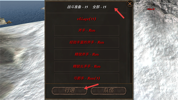 3、戰(zhàn)斗準(zhǔn)備階段可查看斧手、長(zhǎng)矛手等兵種,根據(jù)需求選擇選好后點(diǎn)擊行進(jìn)讓部隊(duì)前往戰(zhàn)斗區(qū)域?yàn)閼?zhàn)斗做準(zhǔn)備。