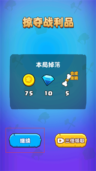 3、擊敗敵人或完成一局游戲后,會獲得金幣、鉆石、坐騎合成材料等戰(zhàn)利品,點(diǎn)擊繼續(xù)按鈕可以進(jìn)入下一局游戲。