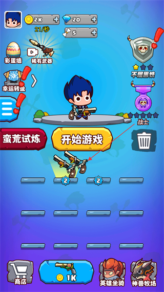 1、玩家下載游戲之后在游戲主界面,點(diǎn)擊開始游戲按鈕進(jìn)入游戲,可提前在主界面下方查看和選擇武器,提升初始戰(zhàn)斗能力。
