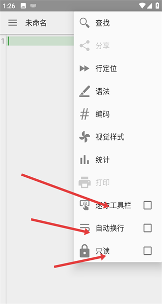 1、打開編輯器點(diǎn)擊右上角菜單按需調(diào)整編輯模式進(jìn)行勾選,自動換行讓文本適配屏幕寬度,只讀鎖定文件防止誤改。