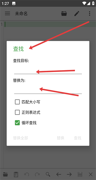 3、觸發(fā)查找功能在彈窗輸入查找目標(biāo)的內(nèi)容和替換為的內(nèi)容,設(shè)置匹配規(guī)則大小寫和正則等批量快速替換文本。