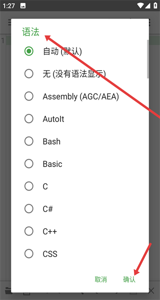 4、進(jìn)入語法設(shè)置選擇自己所需的對應(yīng)編程語言如C和C+,開啟語法高亮讓代碼閱讀更清晰,選好后點(diǎn)確認(rèn)應(yīng)用。