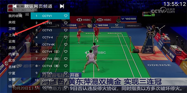 2、點(diǎn)擊頻道切換入口后,會彈出包含多個頻道的列表,在列表找到上海等地方頻道選項,點(diǎn)擊該選項,切換到對應(yīng)的地方頻道。