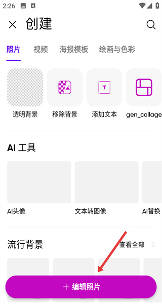 1、打開圖片編輯應(yīng)用,在創(chuàng)建頁面,找到下方醒目的編輯照片按鈕,點(diǎn)擊該按鈕,從手機(jī)里選擇要編輯的圖片。