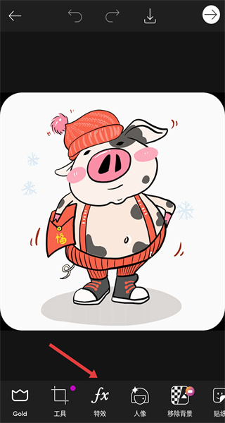2、圖片加載進(jìn)入編輯界面后,在界面下方的功能欄里,找到特效按鈕,點(diǎn)擊該按鈕,進(jìn)入特效選擇頁面。