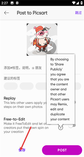4、確認(rèn)特效應(yīng)用無誤后,進(jìn)入分享或保存頁面,在該頁面找到保存按鈕,點(diǎn)擊該按鈕,將編輯好的圖片保存到手機(jī)中。