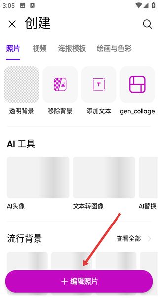 1、打開圖片編輯,在創(chuàng)建頁面,找到下方顯眼的編輯照片按鈕,點(diǎn)擊該按鈕,從手機(jī)里選擇要編輯的圖片。