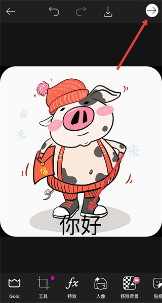 2、圖片加載進(jìn)入編輯界面后,對(duì)圖片進(jìn)行添加文字等編輯操作,完成后點(diǎn)擊界面右上角的箭頭形狀按鈕,進(jìn)入導(dǎo)出設(shè)置頁面。