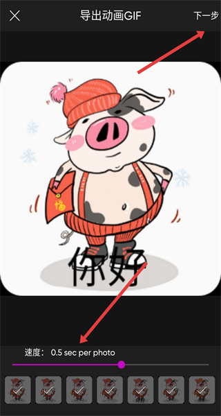 3、在導(dǎo)出設(shè)置頁面,選擇導(dǎo)出為動(dòng)畫GIF格式,還能調(diào)整播放速度等參數(shù),設(shè)置好后點(diǎn)擊下一步按鈕。