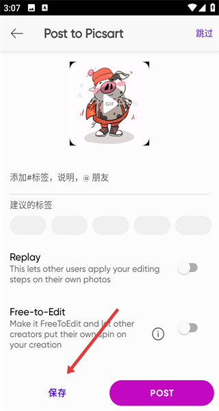 4、進(jìn)入分享或保存頁面后,找到保存按鈕,點(diǎn)擊該按鈕,將制作好的動(dòng)畫GIF保存到手機(jī)中。