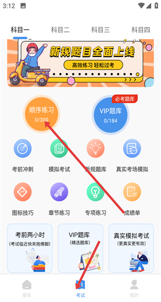 1、進(jìn)入App點(diǎn)擊屏幕下方考試頁,選科目一點(diǎn)擊橙色順序練習(xí)按鈕開始刷題按順序?qū)W習(xí)摩托車駕駛證300道題。