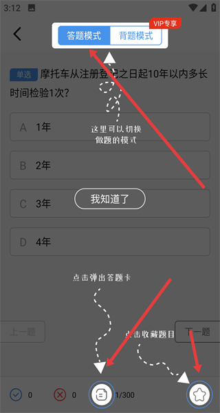2、答題時(shí)可切換答題模式進(jìn)行做題選答案或背題模式去看解析記知識點(diǎn),點(diǎn)擊底部答題卡收藏按鈕管理答題進(jìn)度和收藏題目。