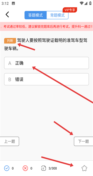 3、遇到判斷題等題型選答案后點(diǎn)下一題繼續(xù),底部能夠顯示答題進(jìn)度,還可以點(diǎn)擊下方的五角星圖標(biāo)隨時(shí)收藏易錯(cuò)或不會(huì)的題目。