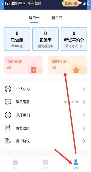 4、切換到我的頁面能夠查看我的收藏找到已收藏題目,我的錯(cuò)題以及已做題量和正確率等數(shù)據(jù)復(fù)盤學(xué)習(xí)情況。
