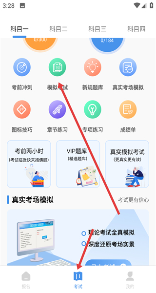 1、進入App考試頁選擇所需要的科目如科目一,點擊模擬考試即可進入模擬考試流程準備開始答題。