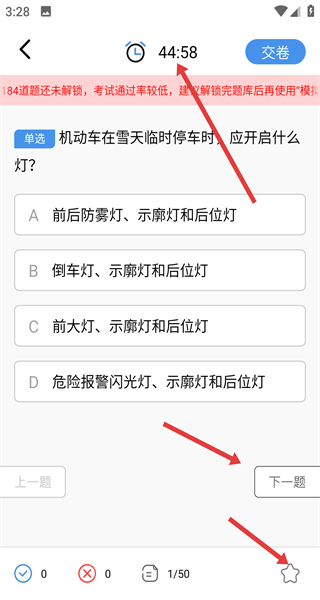 2、答題時頂部顯示剩余倒計時,考生需要注意時間及時交卷,完成一題點下一題,底部記錄顯示當前答題進度。