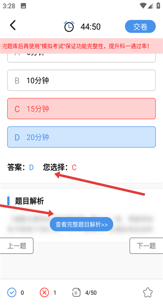 3、答錯題目后頁面顯示正確答案如答案D和您的錯誤選擇C,點擊查看完整題目解析學習錯題知識點。