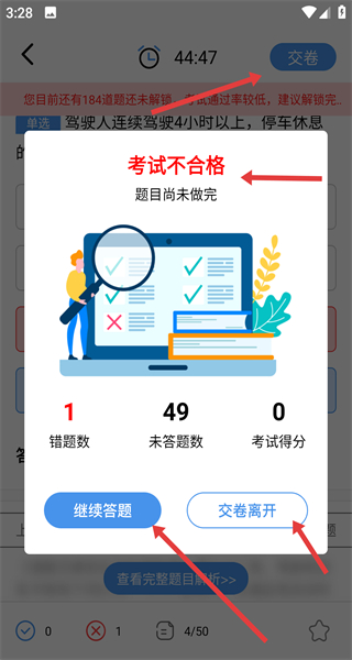 4、若未答完題交卷顯示考試不合格可點繼續(xù)答題再次挑戰(zhàn)考試題目,或交卷離開結束模擬考試重新學習。