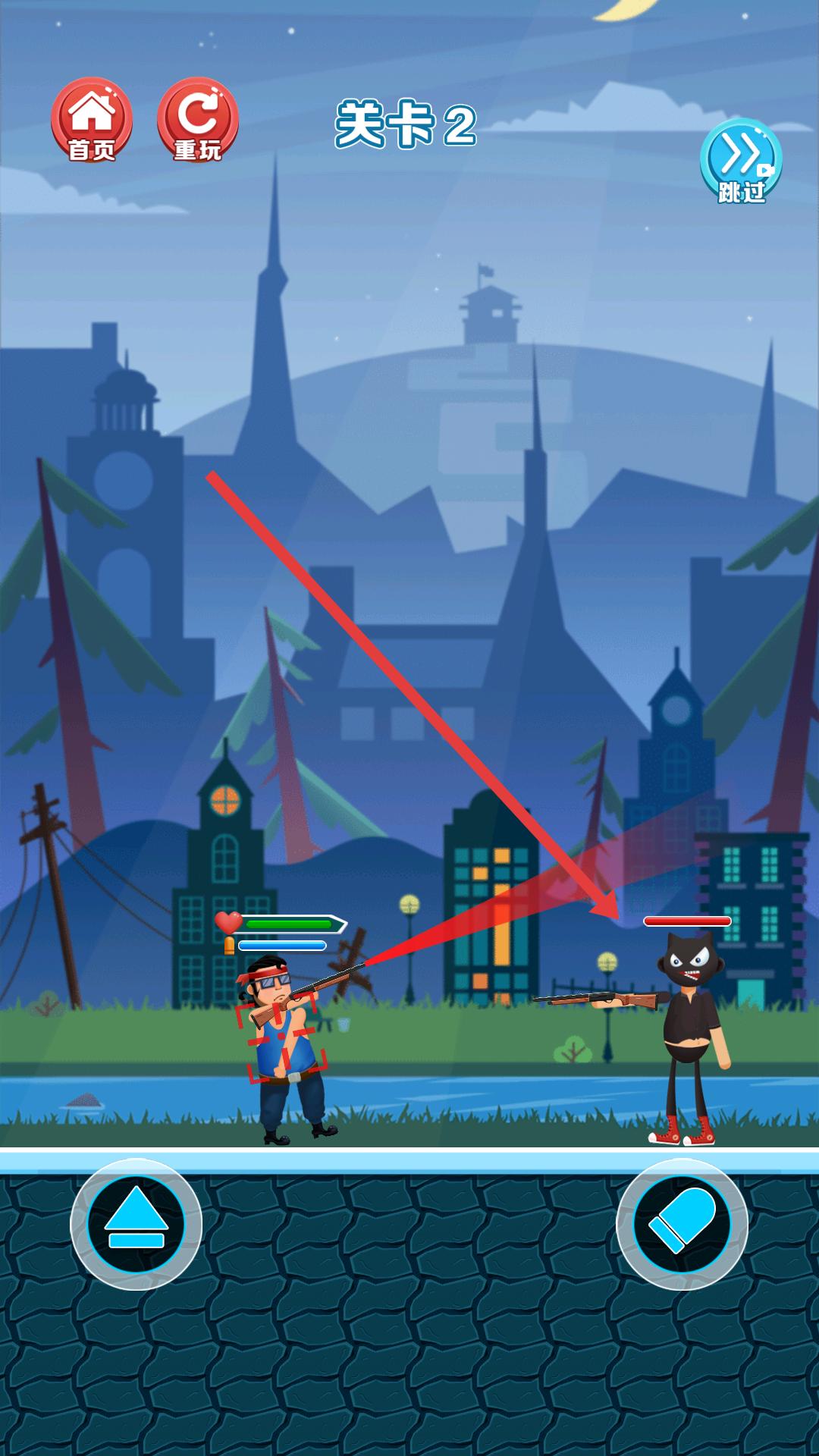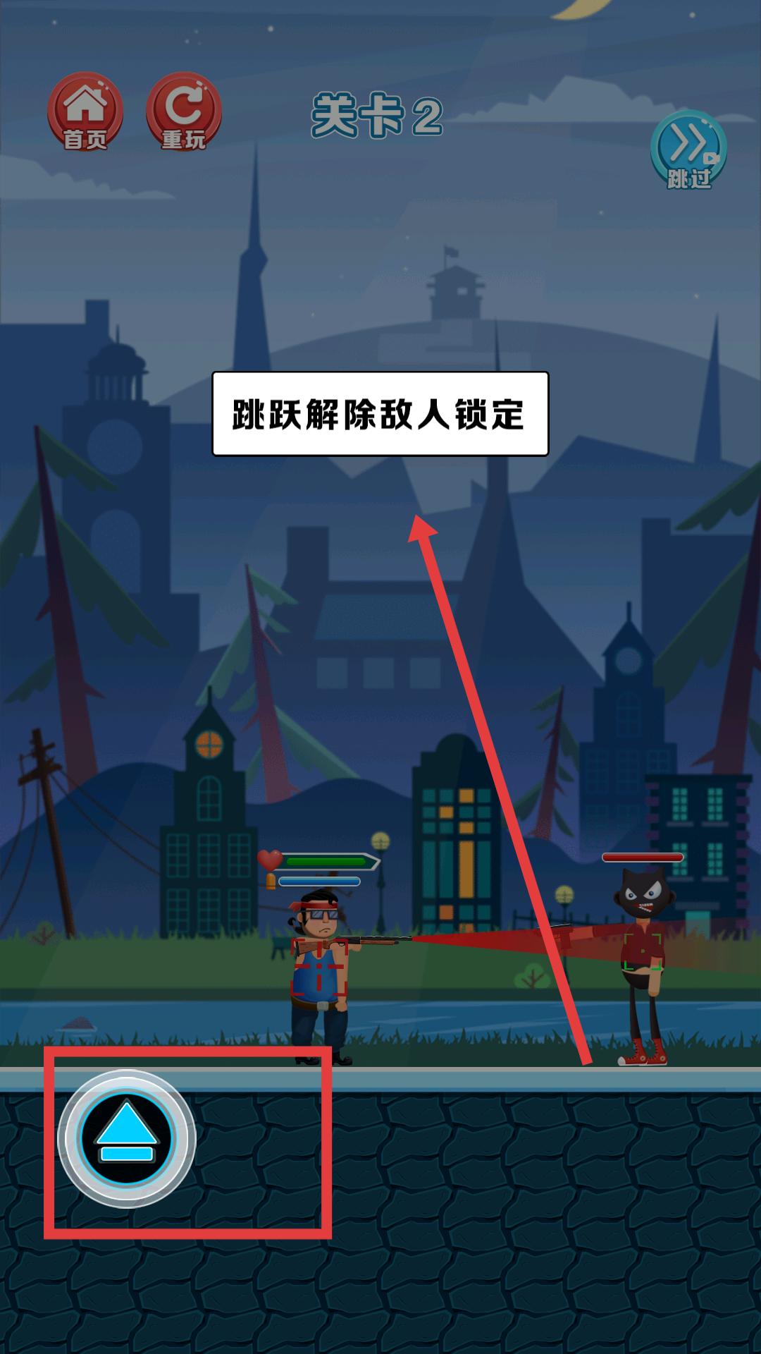 2、進(jìn)入關(guān)卡2當(dāng)被敵人鎖定時(shí),點(diǎn)擊跳躍按鈕,解除敵人鎖定,避免受到敵人攻擊。