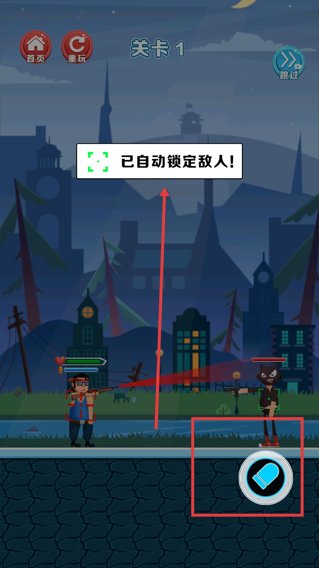 1、進(jìn)入亂斗槍神游戲關(guān)卡1,等待系統(tǒng)自動(dòng)鎖定敵人,鎖定后點(diǎn)擊射擊按鈕,向敵人發(fā)起攻擊。