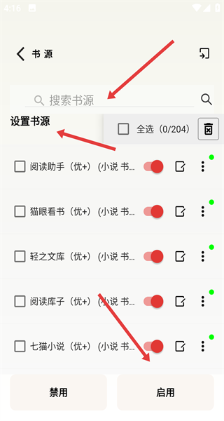 2、在書源頁(yè)可搜索書源對(duì)已有書源如閱讀助手和貓眼看書選擇啟用或禁用調(diào)整可用書源,也可以自行搜索查找想要的書源。