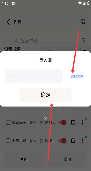 3、點(diǎn)擊導(dǎo)入源點(diǎn)擊選擇文件按鈕,從手機(jī)找書源文件,找到文件后點(diǎn)確定按鈕即可導(dǎo)入自定義書源。