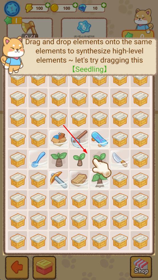 2、在棋盤拖動(dòng)相同元素如幼苗合成高級(jí)物品,按指引操作,積累資源解鎖新合成物。