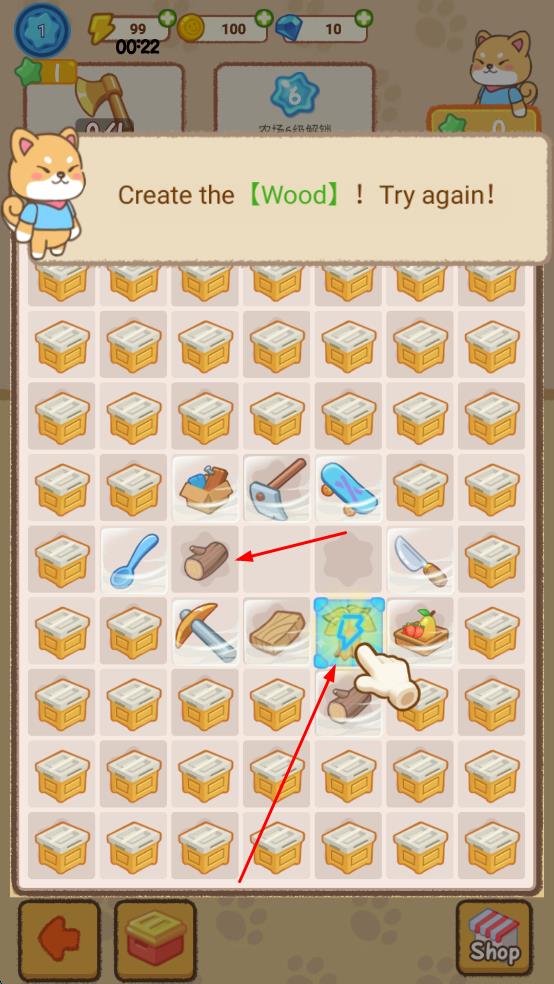3、按提示合成木材,失敗重新嘗試,成功獲得新道具,填充背包為完成訂單準(zhǔn)備資源。