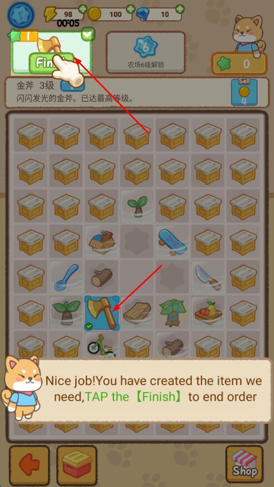 4、合成金斧后點(diǎn)擊Finish結(jié)束訂單,獲取獎(jiǎng)勵(lì),升級(jí)工具,繼續(xù)解鎖新合成與訂單。