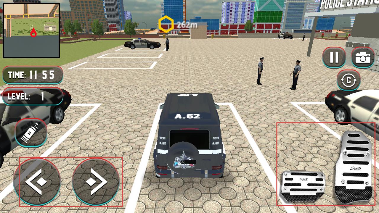 2、在停車場利用左右方向按鈕控制警車方向,油門、剎車按鈕控制車速,將警車開出停車場。