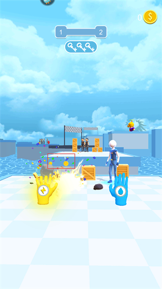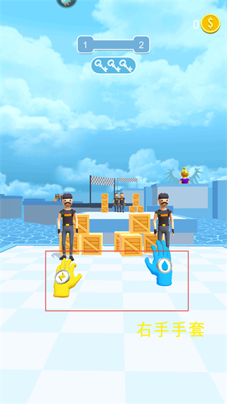1、畫面會出現不同的手套代表不同技能,選擇合適的手套技能,比如左邊手套是電擊類技能,右邊手套可冰凍以此來應對關卡中的敵人。
