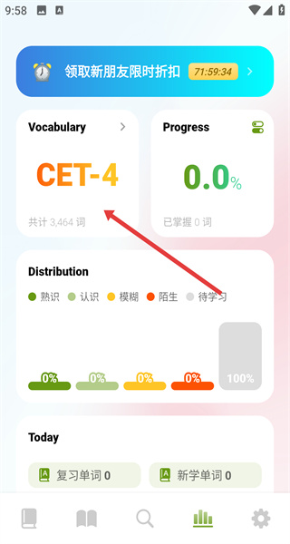 1、進入軟件后,選擇要學(xué)習(xí)的詞匯類別,比如四級詞匯,進入對應(yīng)的詞匯學(xué)習(xí)界面,開啟詞匯學(xué)習(xí)之旅。