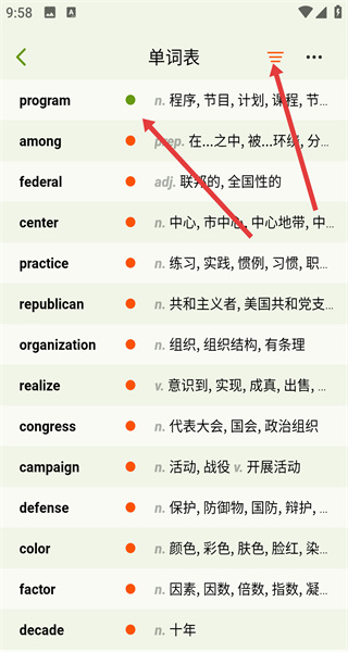 2、在單詞表界面,點擊右上角的菜單按鈕,可對單詞表的展示方式等進行設(shè)置,以便更便捷地查看單詞。