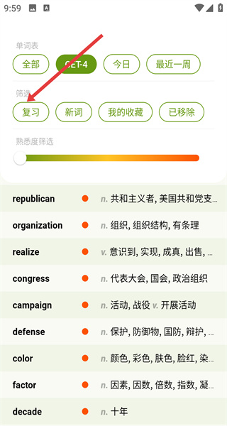 3、學(xué)習(xí)單詞時,可點擊復(fù)習(xí)選項,對之前學(xué)過的單詞進行回顧,鞏固記憶,加深對單詞的印象。