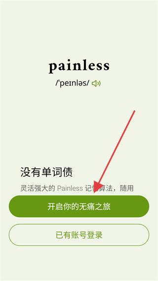 1、進入軟件后點擊開啟你的無痛之旅,進入單詞學(xué)習(xí)流程,利用靈活強大的Painless記詞算法,開始無痛記單詞之旅。
