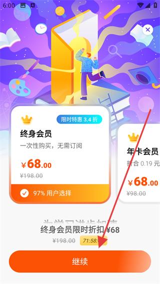 4、若想開通會員可選擇終身會員或年卡會員,查看限時特惠價格后,點擊繼續(xù)完成會員開通助力單詞學(xué)習(xí)。