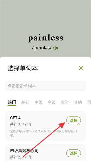 2、在選擇單詞本頁面瀏覽熱門、基礎(chǔ)等分類下的詞本,如CET4、四級真題核心詞等,點擊選擇確定要學(xué)習(xí)的單詞本,明確學(xué)習(xí)目標。