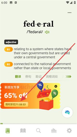 3、在單詞學(xué)習(xí)頁面可查看單詞的音標、詞性、釋義等內(nèi)容,如federal的相關(guān)信息,同時注意新朋友專享的限時折扣活動,了解會員優(yōu)惠。