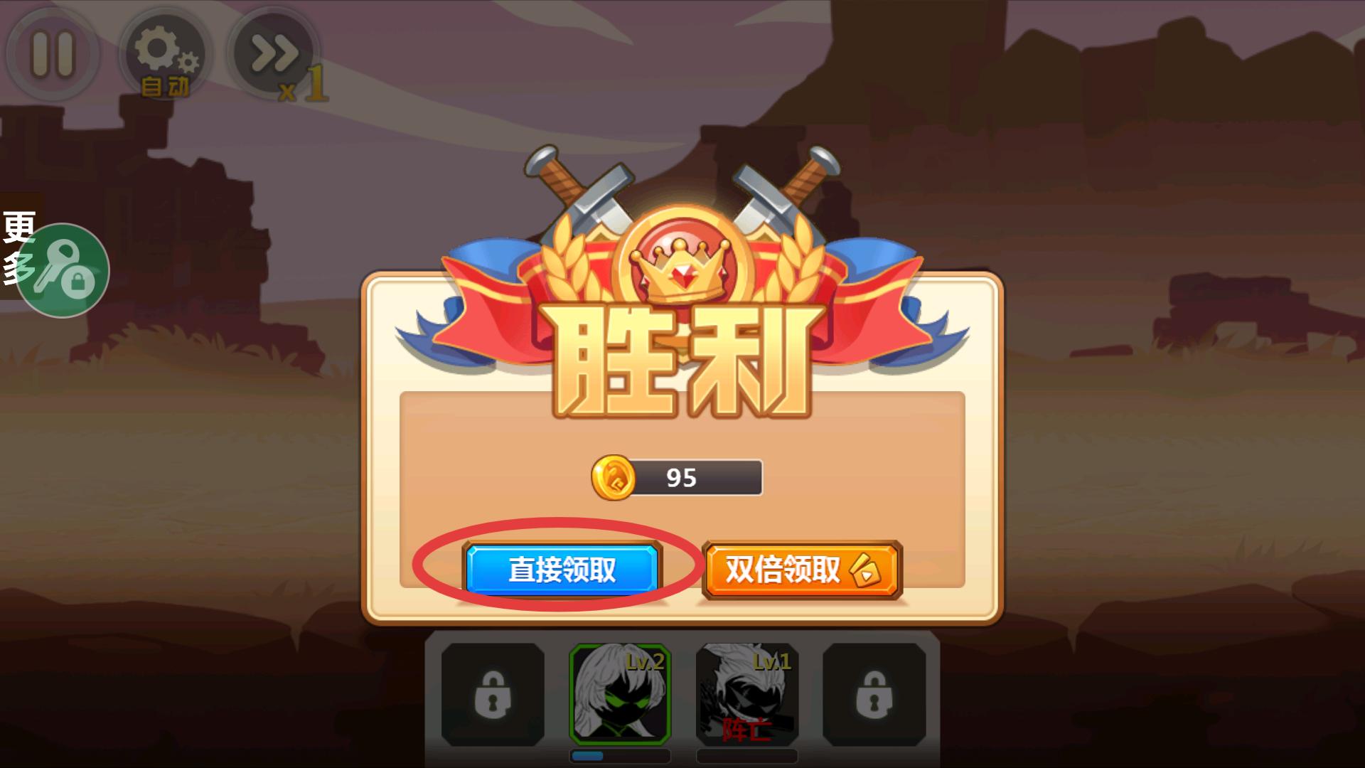 4、戰(zhàn)斗勝利后,界面會顯示勝利及95金幣獎勵,點擊直接領取按鈕,用于后續(xù)角色養(yǎng)成或裝備升級等操作。