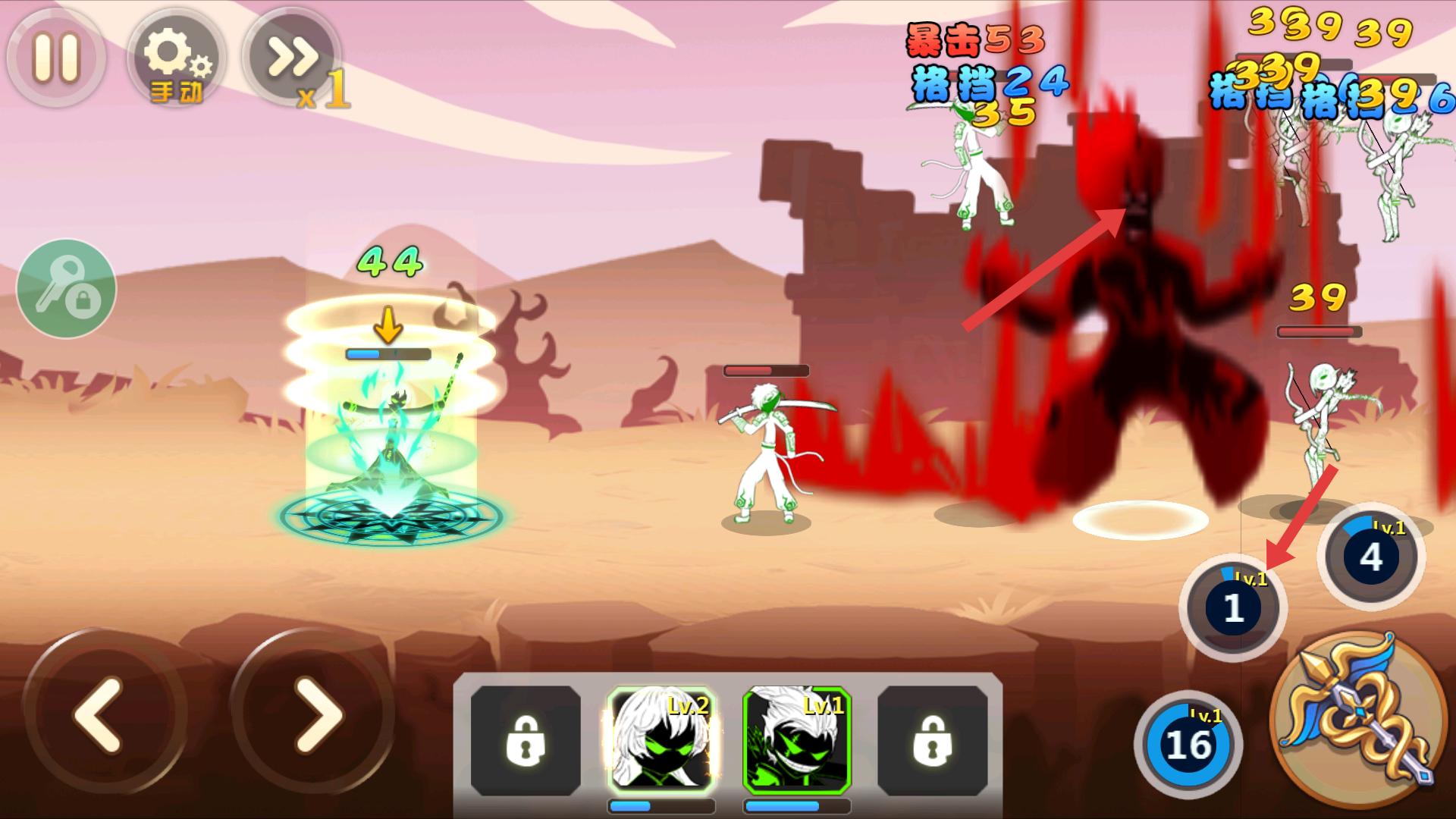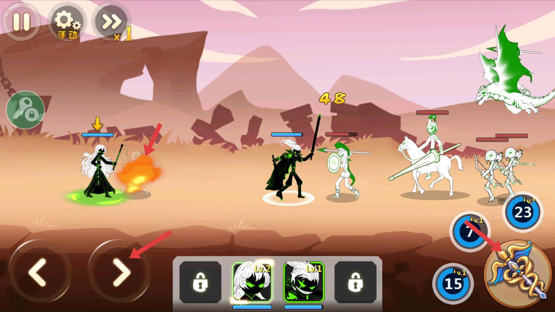 2、可通過下方箭頭按鈕調整角色站位,合理調整站位與釋放技能,能更好應對不同敵人。